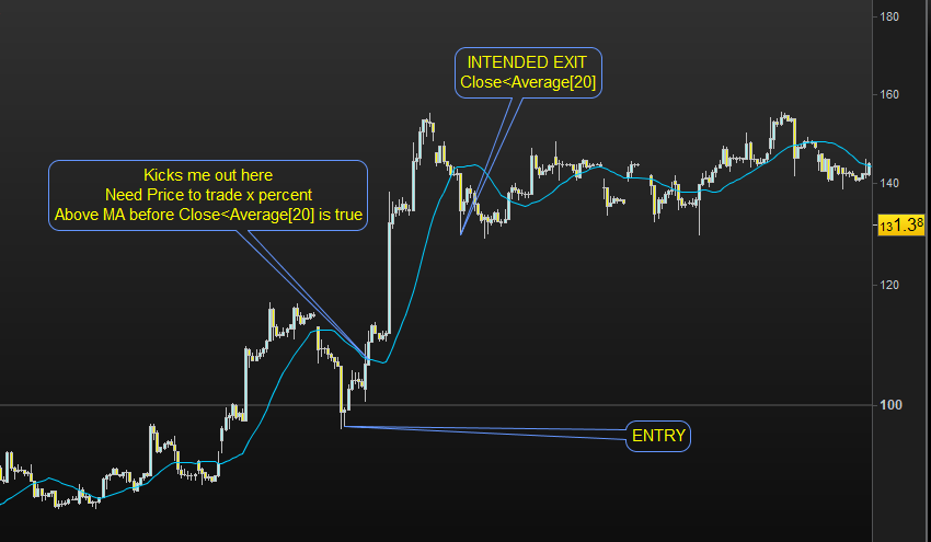 Entry is no issue. Problem is that the entry is below the daily MA, as the price hovers around the daily MA in the process of turning bullish for first time after trade entry, the exit condition is triggered. To solve this i wanted price to trade 20% above positionprice. Once the 20% mark is reached, the exit condition always remains true. For example, If entry price is $10, price goes to $15 and then returns to $11 – I want to exit if Dailyclose<MA in below code.