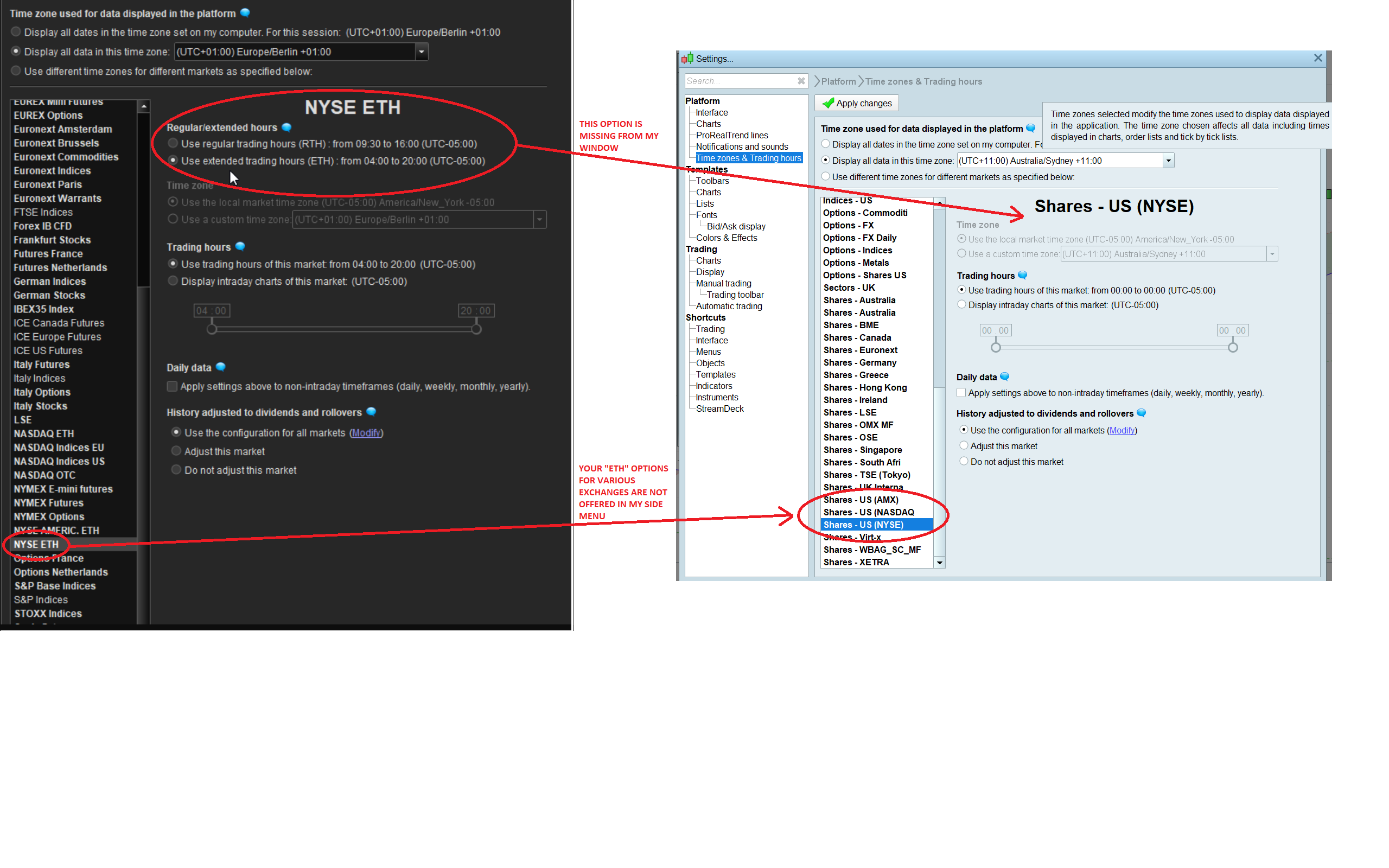 In relation to the trading hours setting, I assume you mean the place at the end of the following pathway: Settings > Platform > Time zones & Trading Hours. I wasn’t sure if this setting defined only which data are displayed and which data are used for backtesting, rather than defining paramaters for auto-trading? But I’d be happy to give it a try. Unfortunately though, my window for this setting looks a little different to yours; more specifically, it’s missing the “Regular/extended hours” section that you’re suggesting I change, and mine doesn’t have any “ETH” versions of markets in the side menu. Please see my side-by-side comparison in the attachment below (could it be because we’re running different versions of PRT? mine is V11.1).