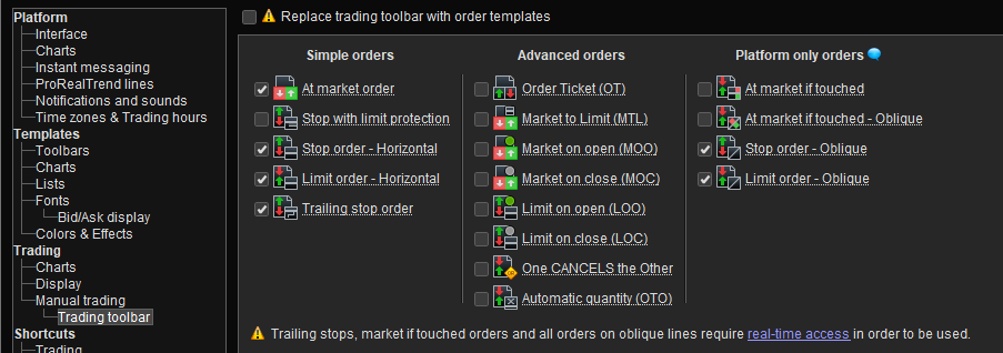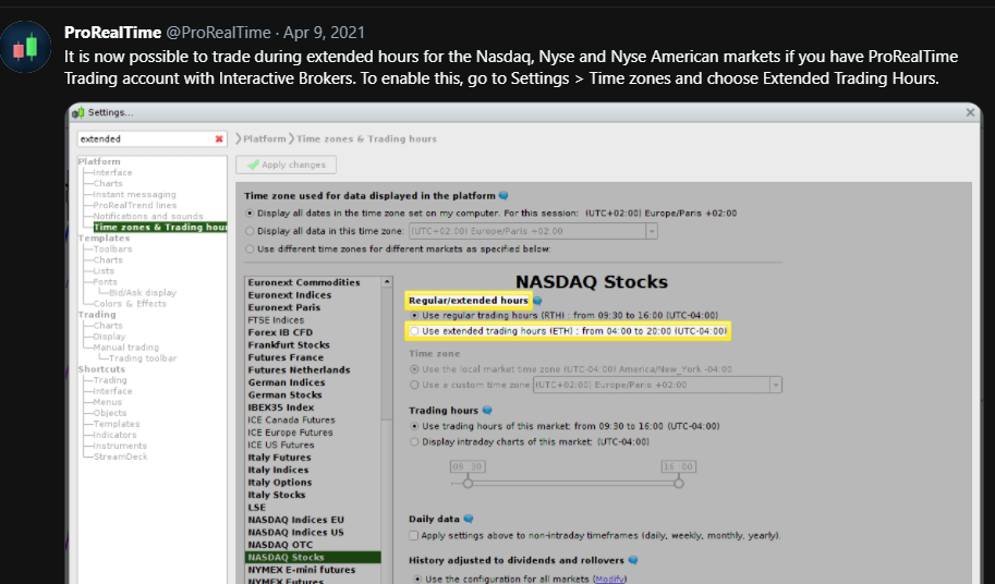 It is now possible to trade during extended hours for the Nasdaq, Nyse and Nyse American markets if you have ProRealTime Trading account with Interactive Brokers. To enable this, go to Settings > Time zones and choose Extended Trading Hours.