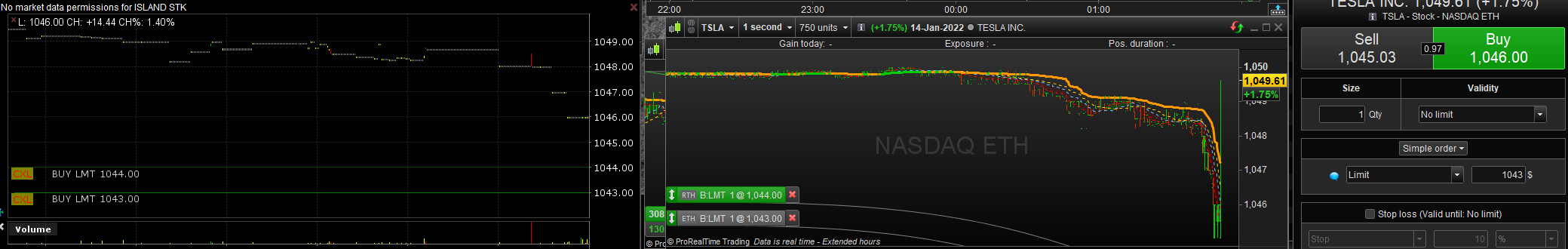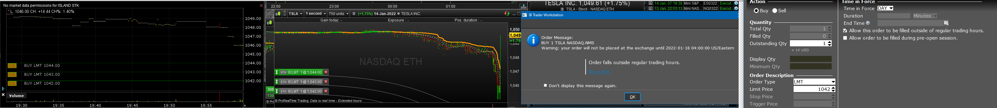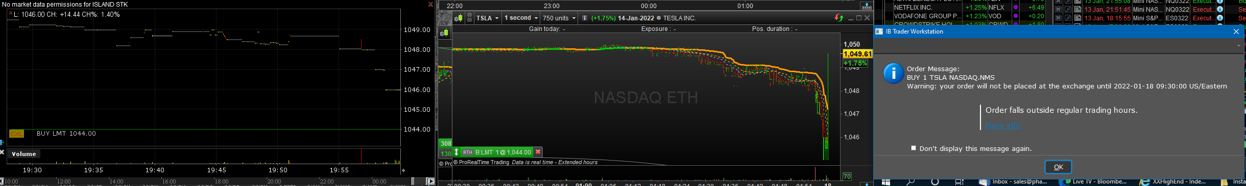 The left-most window is a TWS chart. The middle is PRT (notice the RTH tag) and see the TWS-message in the right-most window.