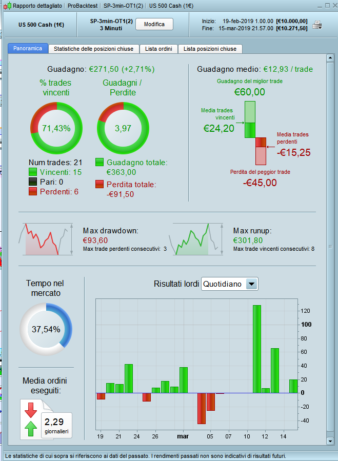 Lo spread è di 0.4 punti. sp500 1€ a 3 min, broker IG. Questo già soffre molto meno i ribassi e fa poche operazioni. Ho ottimizzato con le variabili medie mobili e stop e profit. L’idea è quella di avere un sistema con poco drow, il minor numero di operazioni e la maggiore stabilità possibile, poi basta aumentare i size.