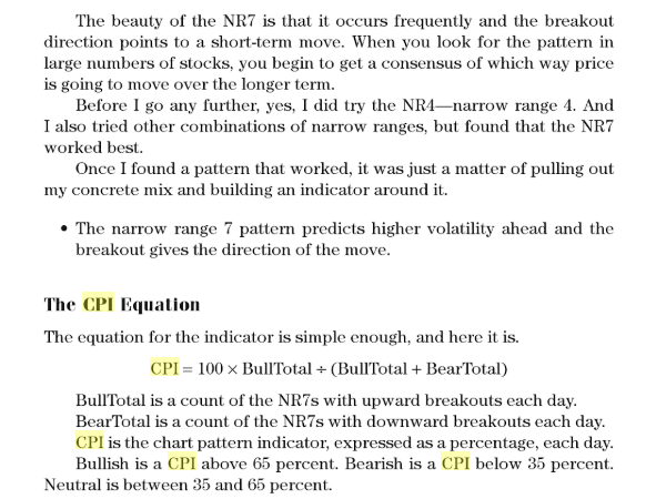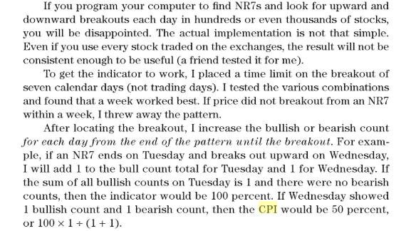 Il pattern NR7 può essere trovato qui, in questo screener della libreria: https://www.prorealcode.com/prorealtime-market-screeners/nr7-pattern-screener/ Sul pattern CPI, è possibile ottenere testo di un immagine della descrizione, molto più facile per noi su cui lavorare! ..