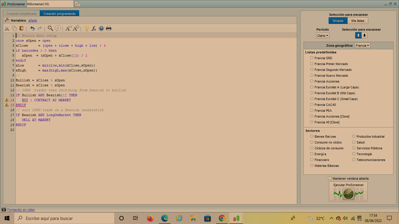 Me hiciste un screneer para obtener señales de compra y de venta con el cambio color en las velasHeikin Ashi, conjuntamente, en el mismo screener. Y funciona perfectamente. Pero tengo el problema de que al tener solamente datos de fin de día en la plataforma ProRealtime solo puedo ver como máximo 50 valores entre alcista y bajistas conjuntamenteen el mismo screener, con lo que me quedan valores sin ver al realizar el screener.