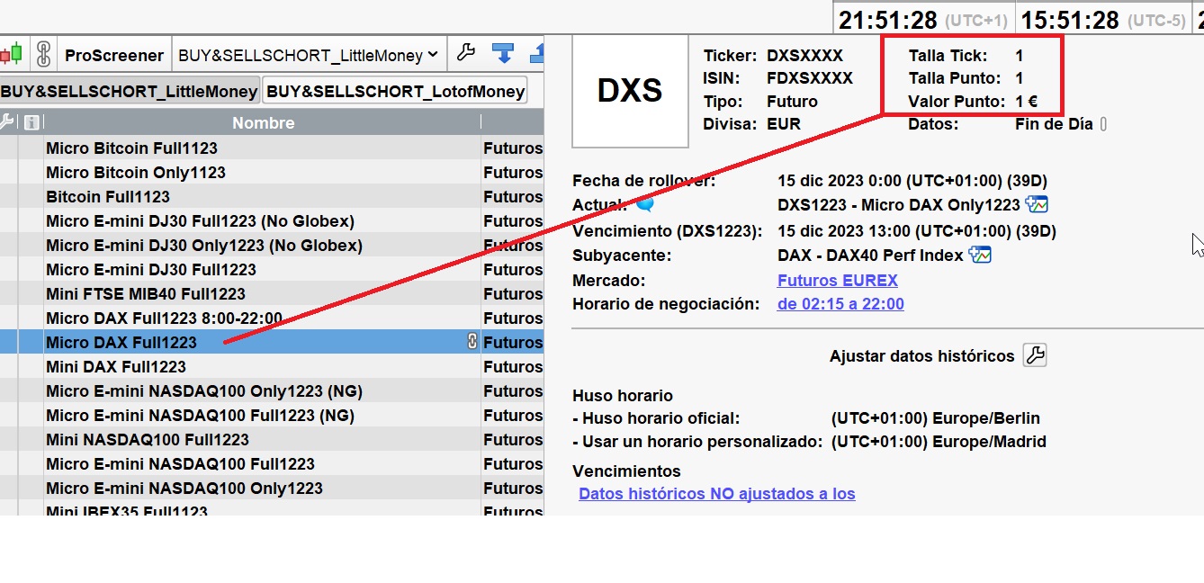 Por ejemplo el futuro del Micro DAX. Éste tiene una talla de tick, una talla de punto y un valor de punto de 1€. Me gustaría poder filtrar los futuros no sólo por las condiciones que utilizo actualmente, sino también por el valor de su punto.