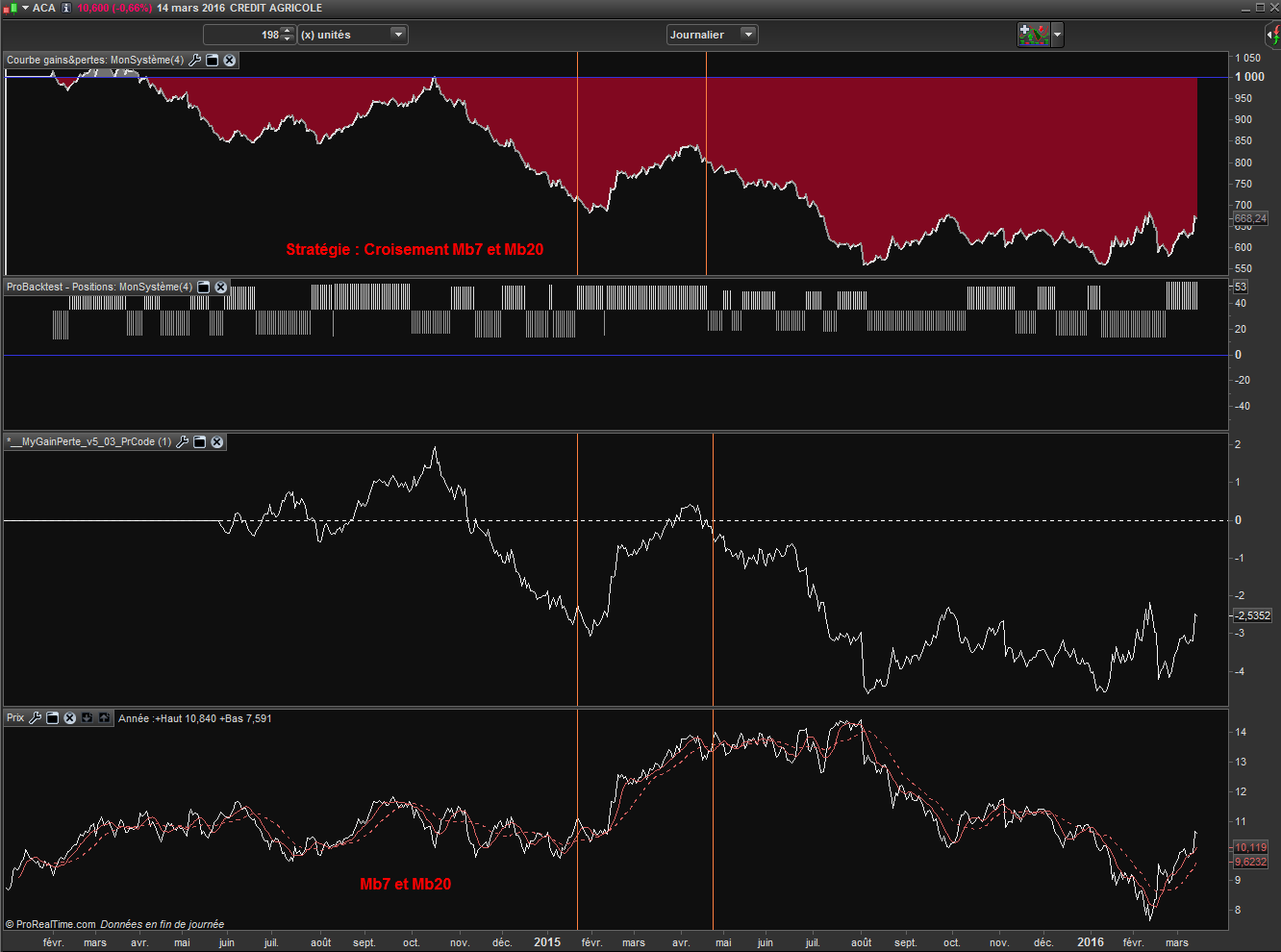 1234567891011121314151617181920212223242526272829303132333435363738394041424344454647484950515253545556/// Exemple : strategire 2 //////////////////c1=Average[7](close)c2=Average[20](close)if c1 crosses over c2 thenposition=1elsif c1 crosses under c2 thenposition=-1else//position=undefinedendif//**************************************************************************//// PROCEDURE ////**************************************************************************//closeMemoA=barindex //varJ=((100-(close/close[1])*100)*-1)/100 // Variation journalière 0.0145 (+1.45%)if barindex > 100 then // varier selon vos besoins/////////////////////// ACHAT ///////////////////if position=1 then//bloc=20prixInversion=close[closememoA-(closeMemoV)] // AxeGainsPertes=GainsPertes +( prixInversion*varj)//*** en invisible pour le remplissage ****ColorRemplissage=GainsPertes-(GainsPertes *0.02)color=1/////////////////// VADE ///////////////////elsif position=-1 then//bloc=10closeMemoA=closeMemoA[1]closememoV=barindexprixInversion=close[closememov-(closeMemoA+1)] // AxeGainsPertes=GainsPertes +( prixInversion*-varj)//*** en invisible pour le remplissage ****ColorRemplissage=GainsPertes+(GainsPertes *0.02)color=-1/////////////////// EXCEPTIONS ///////////////////else//bloc=1endifelse // barindexendif // Fin barindex///////////////////// Finalement ///////////////////////////////return GainsPertes coloured by color as "G&P Mb 7-20",ColorRemplissage as " G&P Remplissage"03/18/2016 at 4:56 PM #3963 -