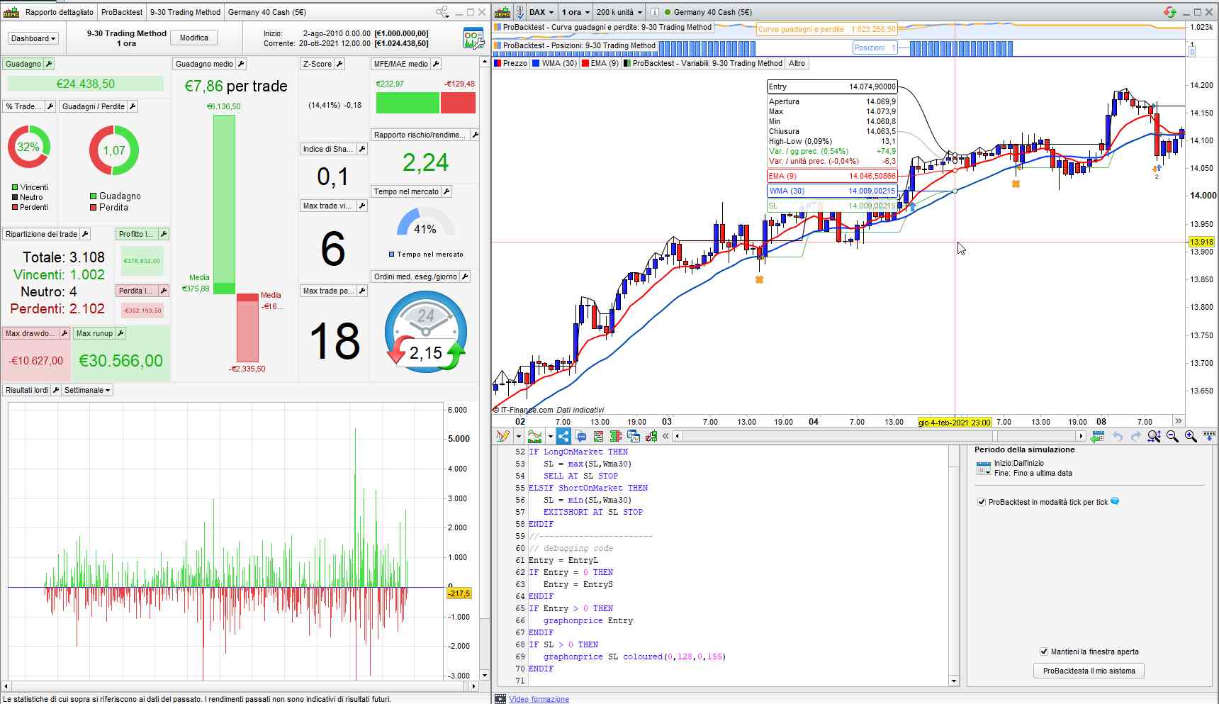 I used the more conservative trailing stop based on WMA30, but I also commented out the more aggressive way. You can simply use either by swapping comment slashes (but I think it shouldn’t be rewarding).