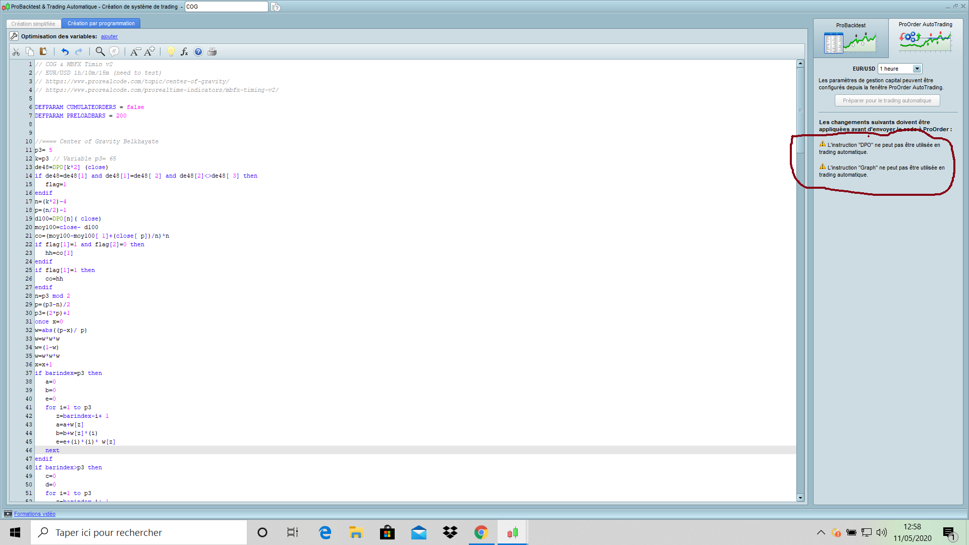 Instead of calling the indicators I’ve included them in the code for easier optimisation and faster loading. But I have an issue with the GRAPHONPRICE function for the COG indicator. The lines are not plotted the same as if I were to add the indicator on price chart settings manually. In the screenshot I have included COG both in code and Price Chart settings.
