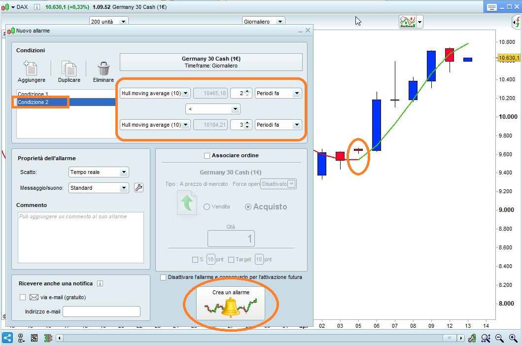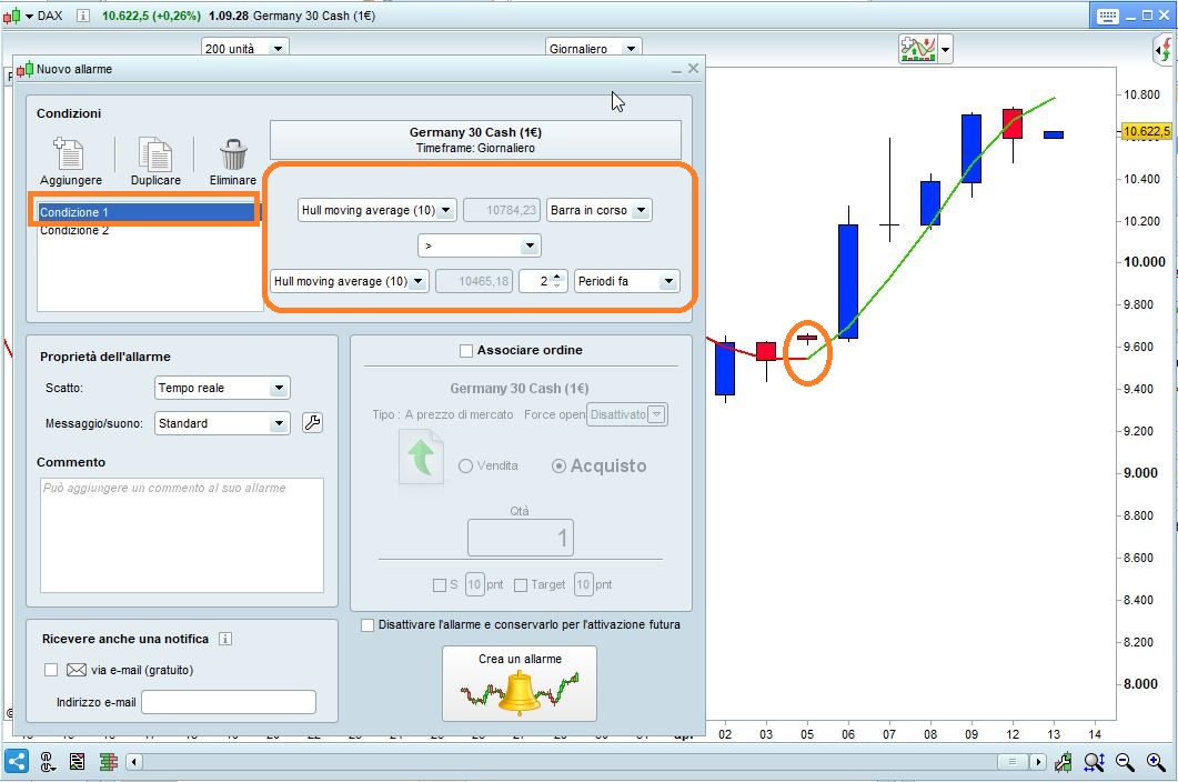 When you add an alarm on your HULL moving average you must set it according to signals returned.