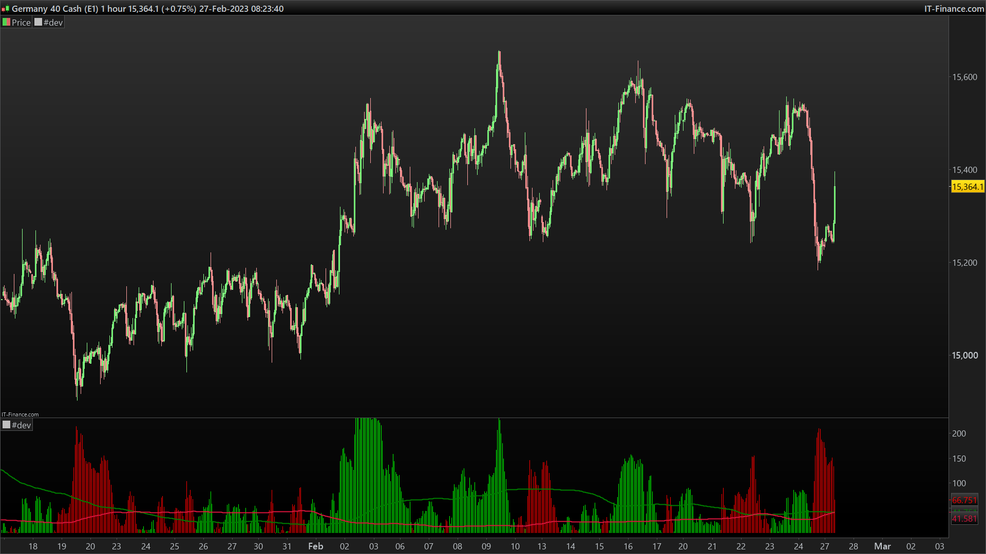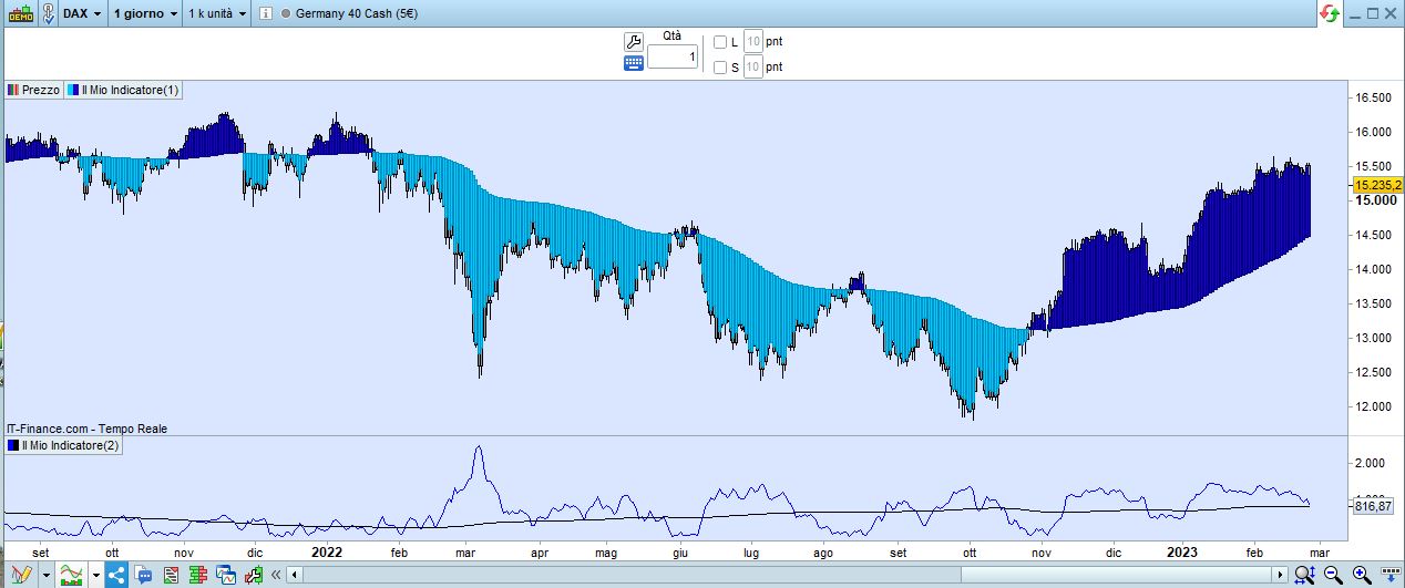 Donc j’ai opté pour calculer un écart avec “ABS” qu’il soit positif ou négatif et ainsi la moyenne mobile ne tendra jamais vers 0. Mais je voudrais différencier le sens de l’écart (positif ou négatif) par une couleur (bleue si le xclose est au dessus la kama etrouge si le xclose est au dessous de la kama).