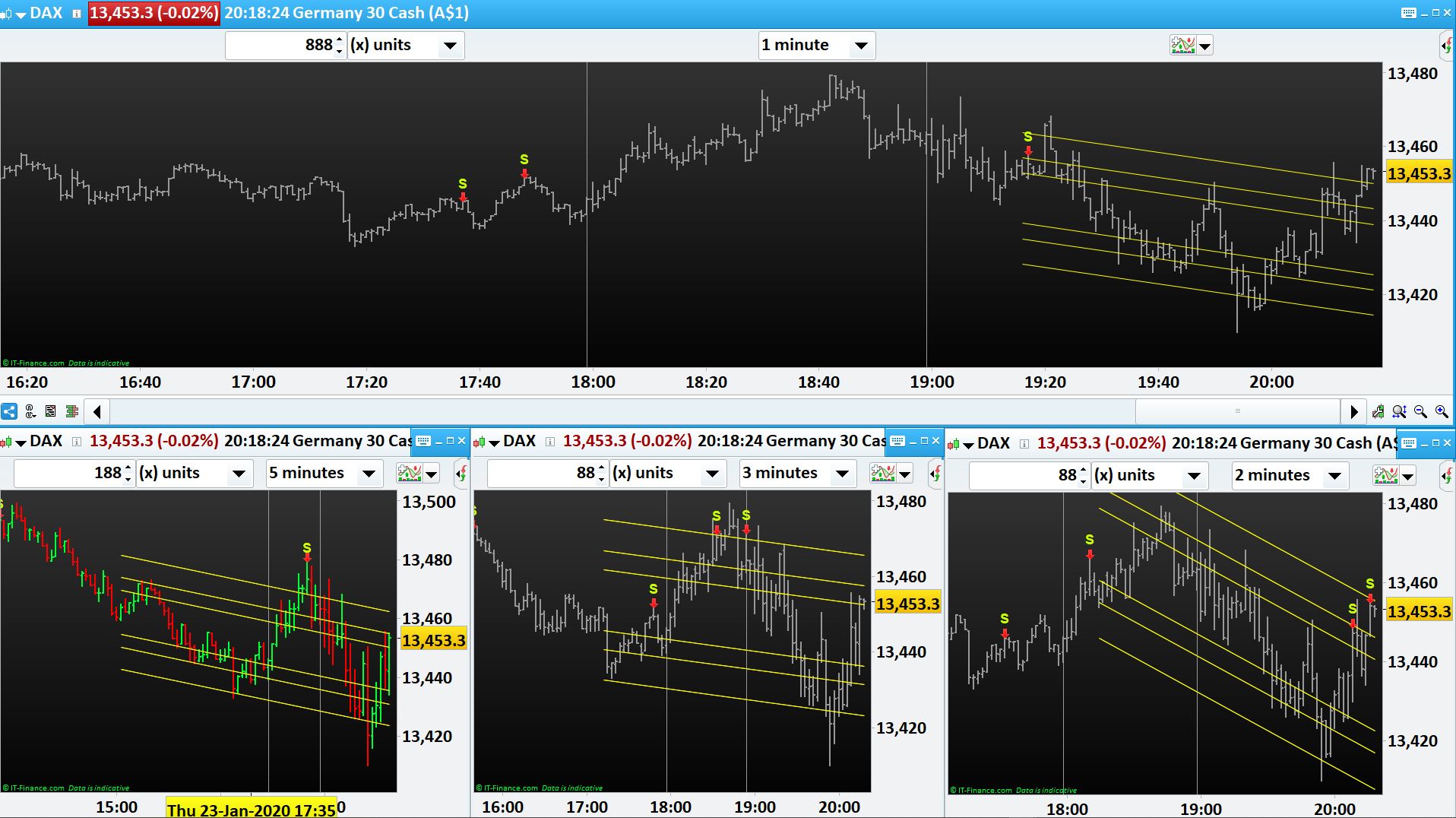 For example if Standard Error Channels (from your code) in 1 minute, 2 minutes, 3 minutes and 5 minutes are pointing to same direction (e.g. UP) then buy at the bottom channel in 1 minute and vice versa for DOWN.