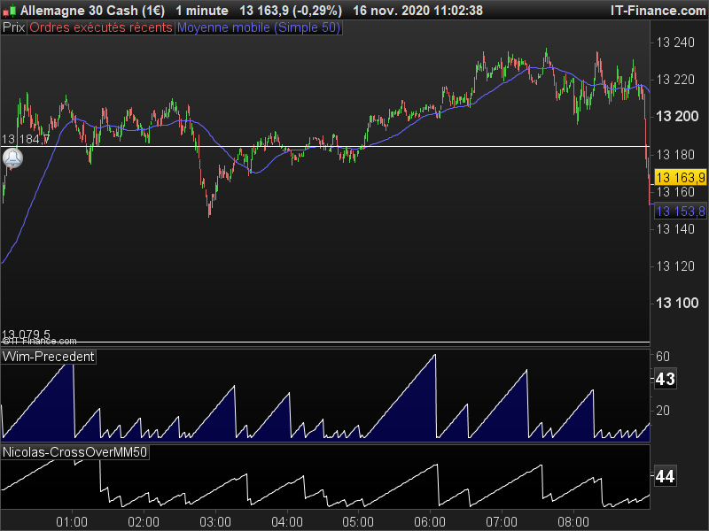 Il me chagrinait beaucoup quand même pourquoi le boucle ne fonctionnait pas correctement. Du coup je l’ai vu. Dans le While-wend je comparait la valeur Close[Precedent] avec la valeur de Average[50][0], écrit comme Average[50] bien sûr. Il a fallu d’ajouter juste [Precedent] derrière la condition, et voilà, comportement correct.