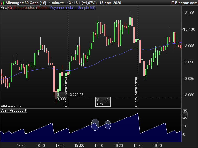 Bonjour. J’ai écrit un tout petit indicateur pour me calculer le nombre de bougies entre bougie actuelle et le franchissement précédent de la MM50. Je me satisfait de ne regarder que la clôture des bougies. C’est à dire, si la bougie actuelle a la clôture au dessus de la MM50, je compte, en reculant dans le temps, le nombre de bougies avec également la clôture au dessus la MM50. Dès que je tombe sur clôture en dessous la MM50, c’est le franchissement cherché et on arrête de compter. Je l’ai essayé avec un loop While-wend et avec For-next. Mais le résultat est souvent (pas toujours) erroné, surtout quand le nombre dépasse la vingtaine. La capture d’écran montre une situation erronée. Les 2 lignes verticales montrent 36 bougies qui séparent le franchissement (gauche) et la bougie actuelle (droite). A cet endroit l’indicateur montre néanmoins une valeur de 25 ! Et comme vous le voyez, même si toutes les bougies entre ces 2 verticales se retrouvent au dessus la MM50, le nombre de bougies jusqu’au franchissment, donné par l’indicateur, ne déscend pas de façon monotone, voire ellipses. Je n’y comprend rien. Voici le code du loop While-wend: