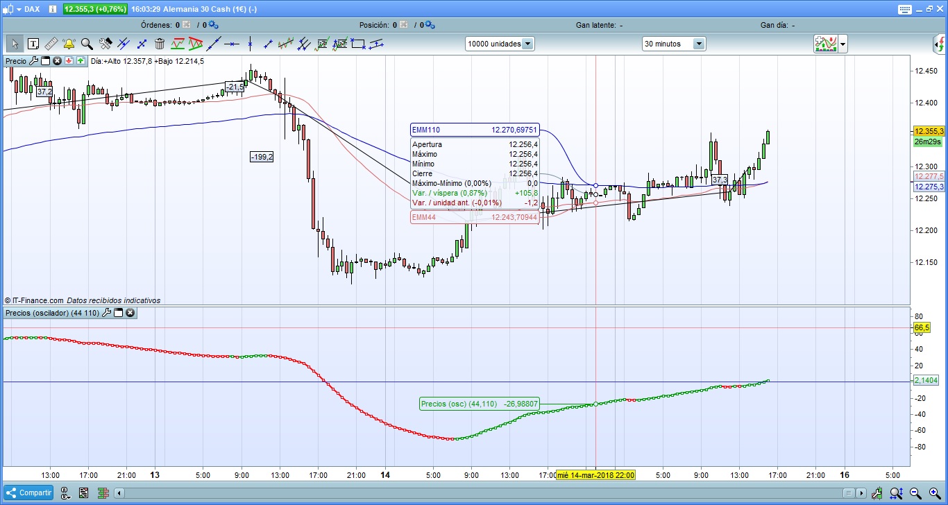 Dos medias exponenciales, la roja de 44 y la azul de 110 aplicadas a cierre.