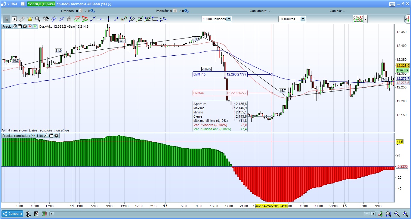 Diferencia entre las dos medias mediante un histograma. De modo que mientras la 44 este por encima de la 110 aparece en verde y por encima de la linea 0; y en rojo al contrario.