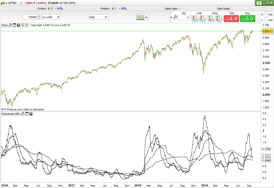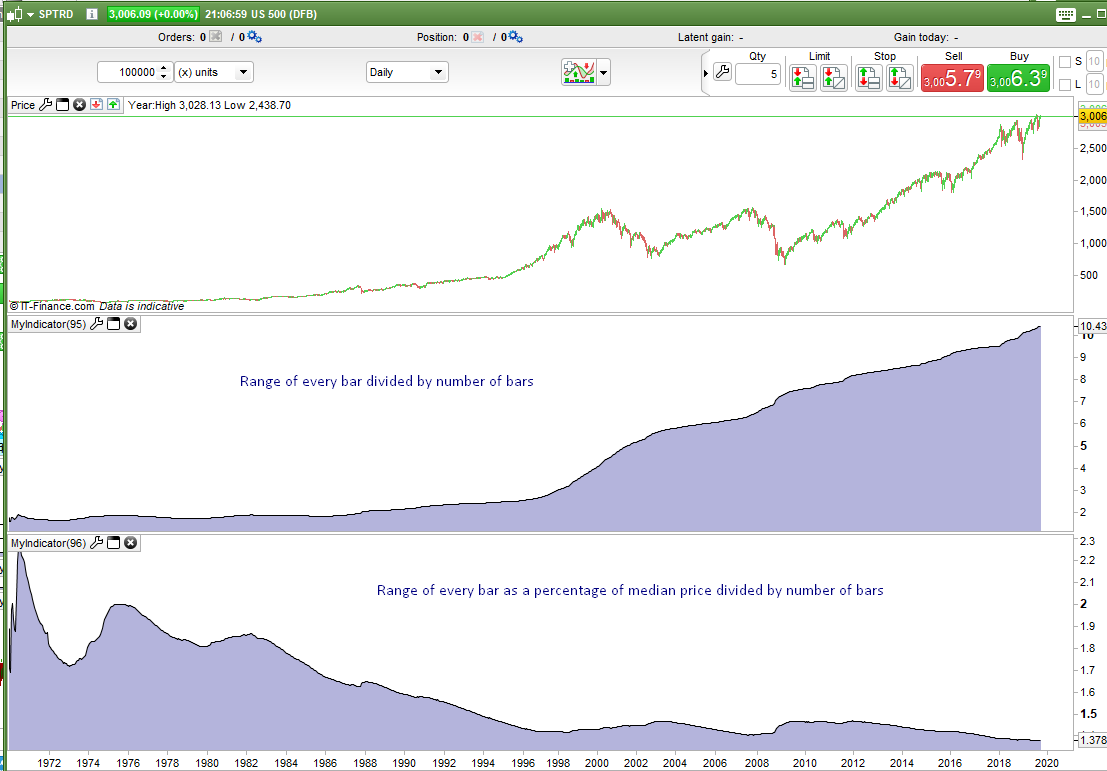 Regarding the all time average of range it is interesting to compare the charts of absolute compared to percentage of price. With percentage of price we have thrown an extra variable in to the calculation – price. One tells us that range is increasing with time and the other tells us that compared to price it is decreasing – which is best only testing will tell us.