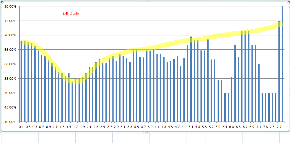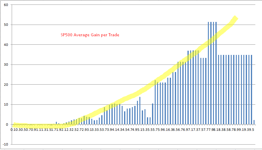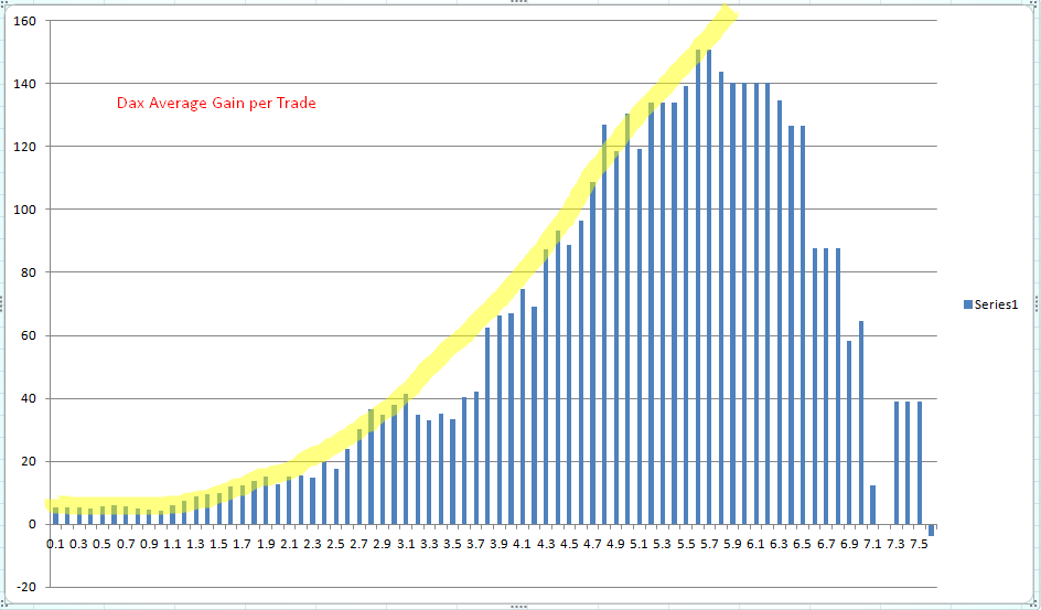 The results were interesting (to me anyway!) and I plotted them in Excel. It has to be taken into consideration that as you get further from the average range for any day the less likely you are to get any trades and so the data for high numbers can be a bit erratic when plotted so I drew on my own interpretation of what I thought was happening. Attached are win rate and average gain per trade charts for the DJI, SP500 and DAX