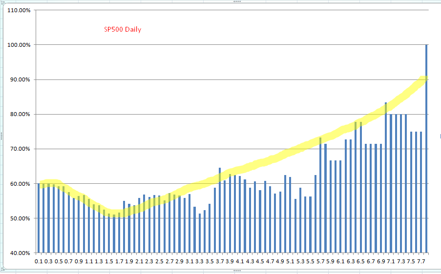 It can be seen that below a certain multiple of the daily average the win rate drops off but then gets better the further from that point we get. It can also be seen in the average gain charts that below a certain multiple there is little or no gain to be had but beyond that the returns start increasing the further away we get.