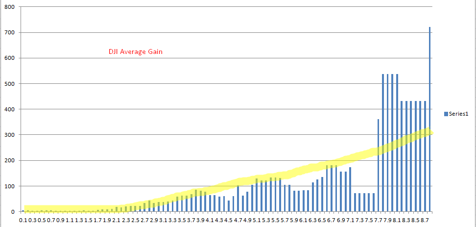 So a good comparison is to go back and compare the theory directly with level stakes. I did this and I plotted the results in Excel and also applied my ‘Average gain per 1’ code snippet so a to be able to make a direct comparison on a level playing field . (Note to GraHal – I added it to the code snippet library as it was not in there!)