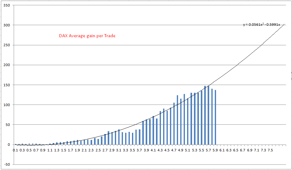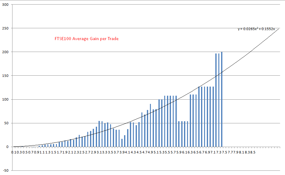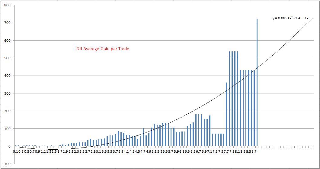 So here are the average gain per trade charts with polynomial trend lines (power 2) starting from zero for the DJI, SP500, DAX and FTSE100. On the last three I removed some of the extreme data as it was effecting the trend plot and was very poor data based on very few trades. I should probably do it on the DJI as well to improve the trend line plotting.