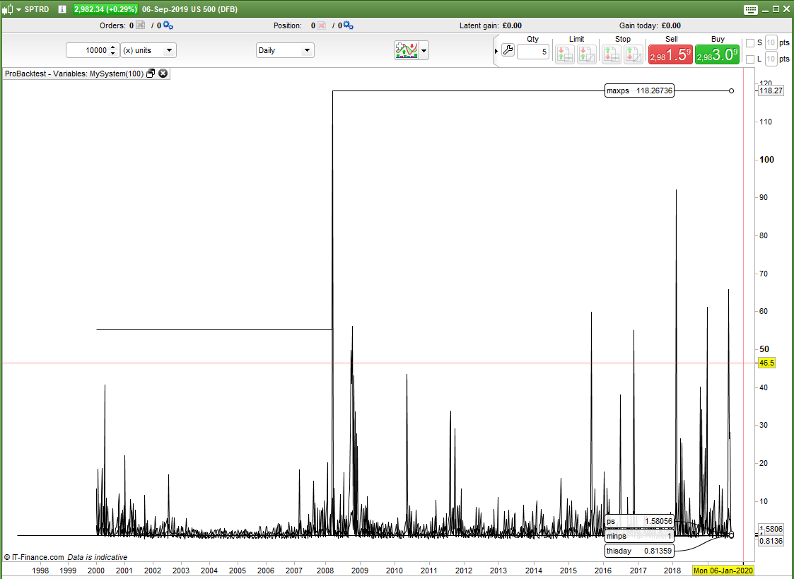 The multiple of the current days range compared to all time average range is recorded as the variable ‘thisday’. This multiple will be anything from 0 upwards as we ignore smaller candles. Then we get our stake size my multiplying it by (thisday – 0.1) and then adding 1. Obviously for very low multiples of the average range we get small stake sizes so we then set a minimum stake of 1. It might actually be better not to trade these positions as our position size is larger than our theory says we should be placing.