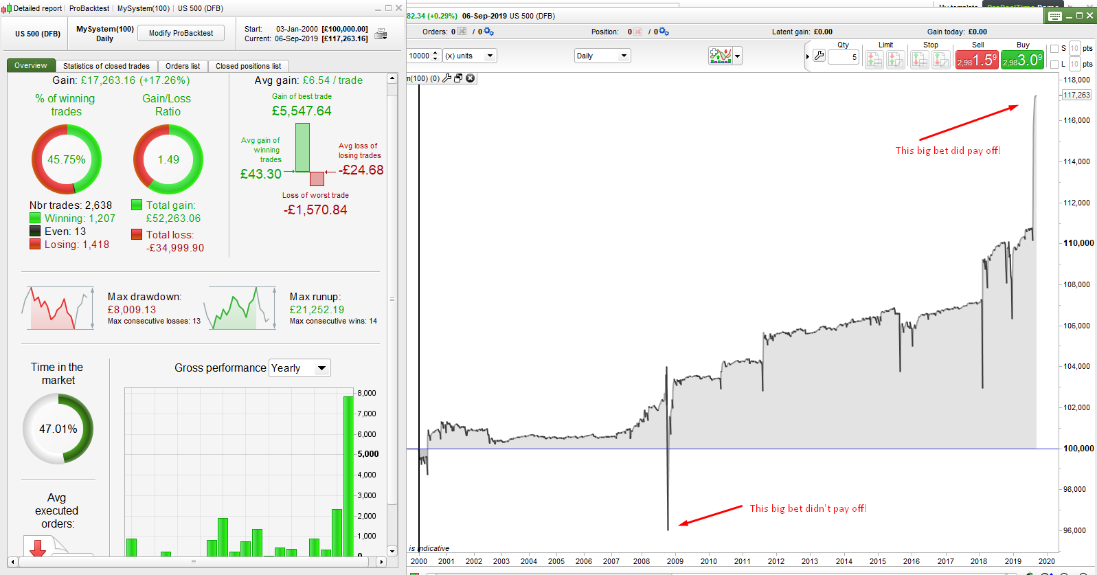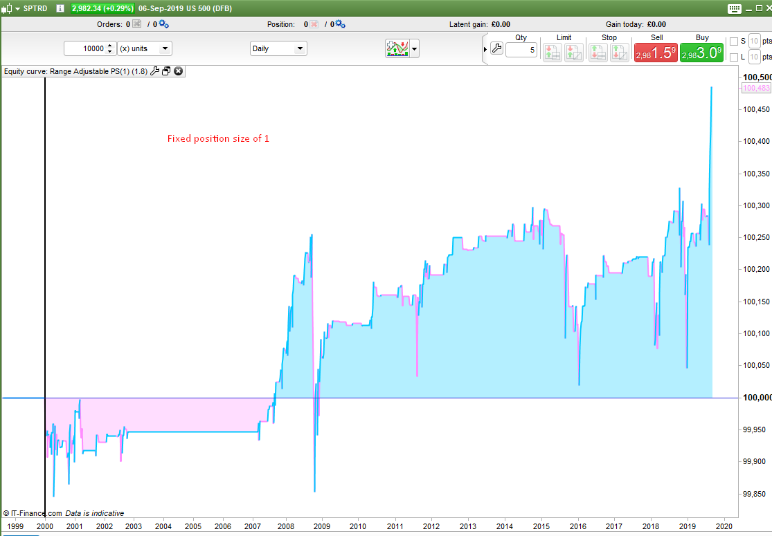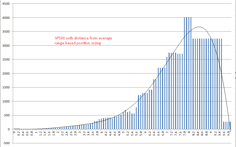 I tested the position sizing on the SP500 with the same simple strategy allowing it to adjust the position size indefinitely based on size of range. Every time there was a bigger than average candle and it was red it bought and sold on the next bar. The results are in the image attached. There is also an image of the position sizes and as you can see some of them are quite scary but when they pay off it is great – when they don’t however it is not so great. In the image it says that a position didn’t pay off but looking closer it was actually massive draw down. Perhaps a maximum allowed stake is required to prevent heart attacks and phone calls from the broker!