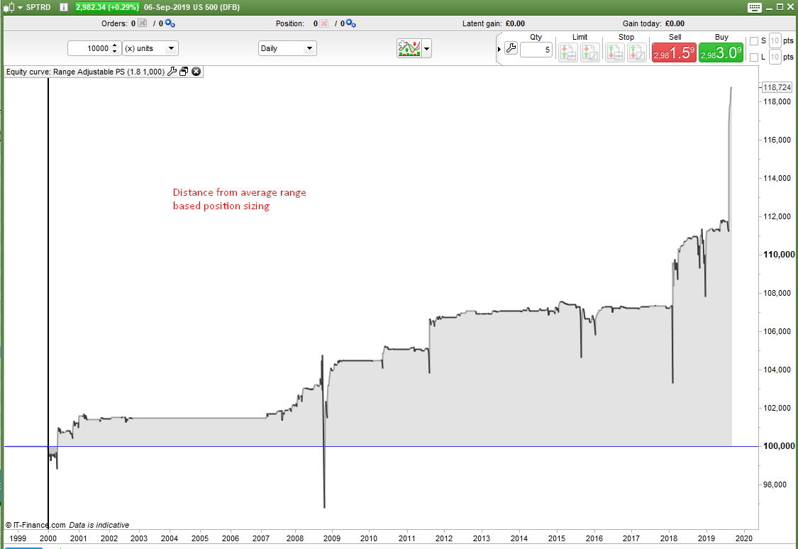 Without position sizing the strategy struggles to make any money unless range is at least 1.7 times the average. With it it makes it from 0 times the average. Attached are the two equity curves for opening positions if the range is 1.8 times the average of any day of the week.