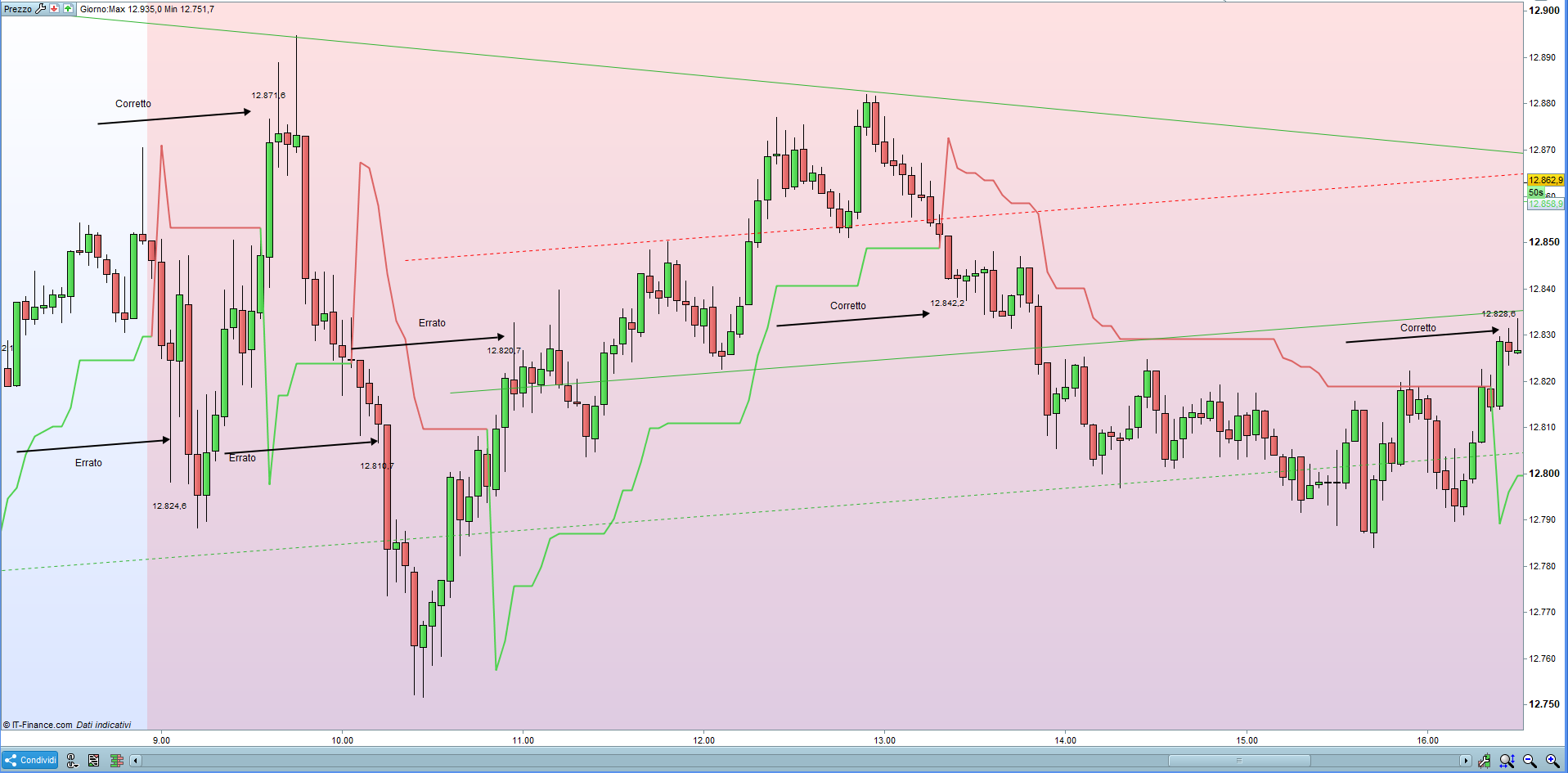 Allego il codice ed un’immagine del grafico dove si vedono casi corretti e casi errati. Da notare che nei casi errati la scrittura avviene sulla candela successiva a quella corretta (ma anche due candele dopo).