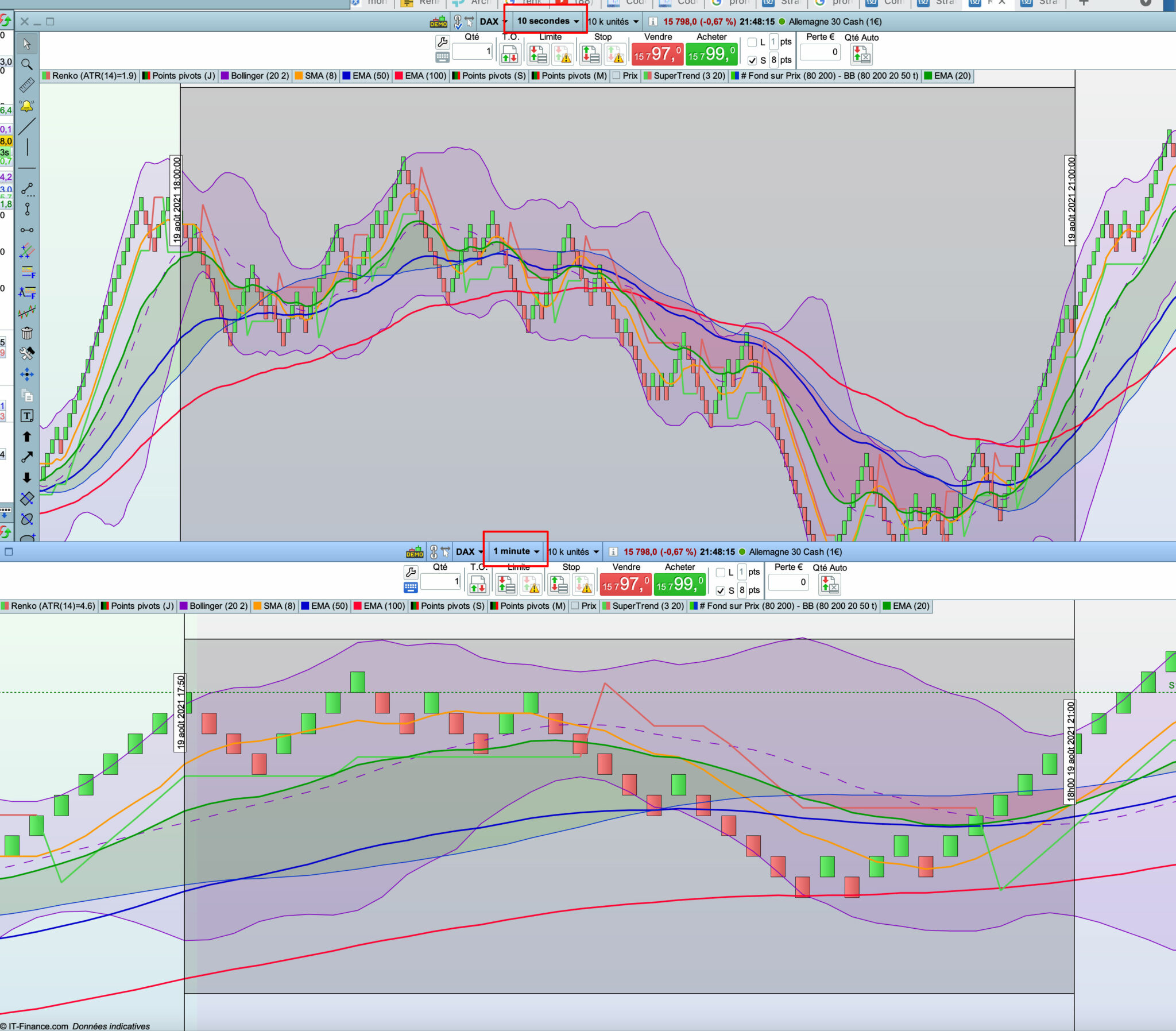 Si vous regarder le graphique du DAX par ex du 18 août en Renko ATR 14 close, vous n’aurez pas la même chose si c’est en 10 sec qu’en 15 min.