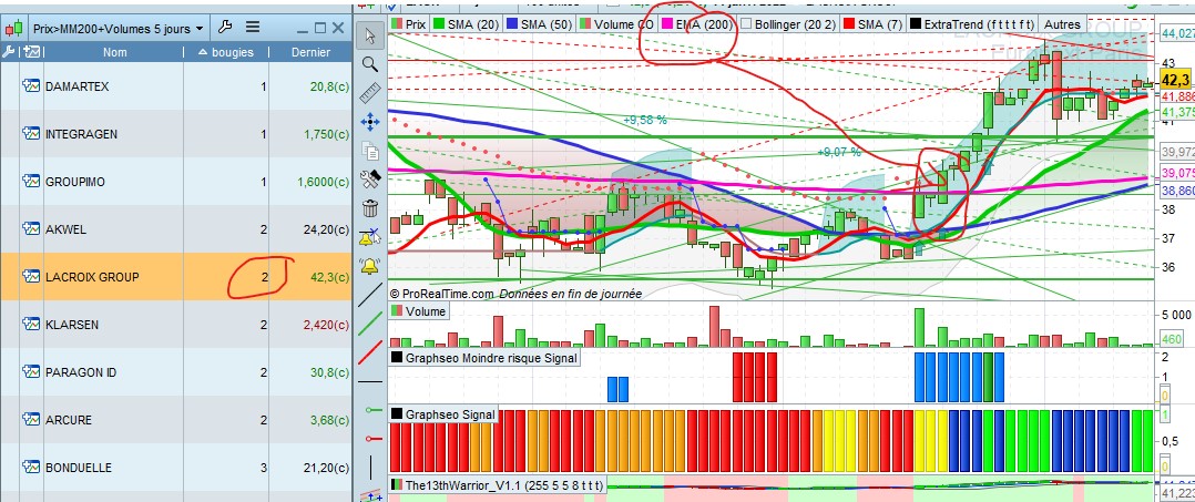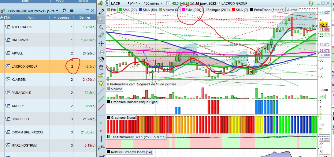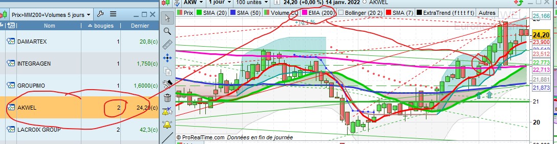 Par contre juste un petit souci avec le décompte des bougie. Par exemple aujourd’hui ave données en fin de journée sur integragen bougie indique 2 alors que le prix est passé au dessus de la valeur hier donc normalement on devrait avoir 1 ou encore sur akwel on a 3 bougies dans la fraicheur du screener alors que l’on est a 10 sur le graphique…