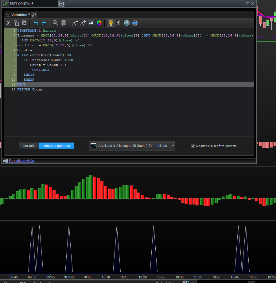 Je souhaite avoir un compteur qui m’indique le nombre d’accélération qui est précédé par une décélération sur le MACD et qui se remette à 0 quand on change la polarité du macd. mon code détecte bien les différentes itération mais la variable count se s’incrémente pas. merci d’avance pour vos solutions.