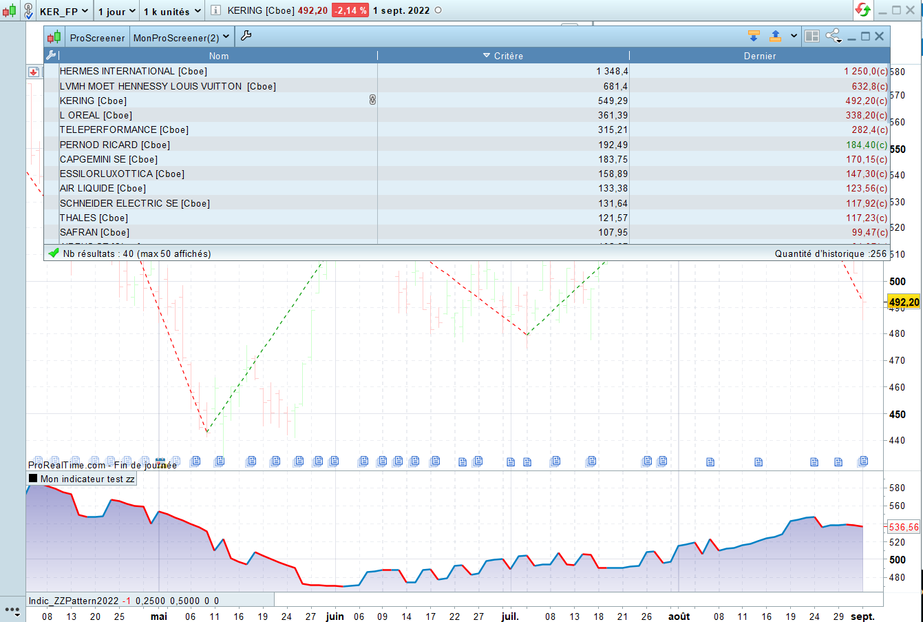 Je suis sur une UT 1 jour, en mode gratuit, je vous affiche le screener et le graphique ouvert depuis le screener de la 3ème ligne, KERING.