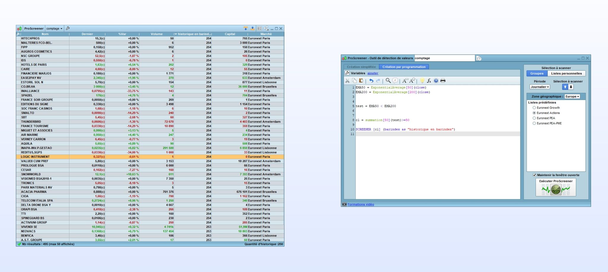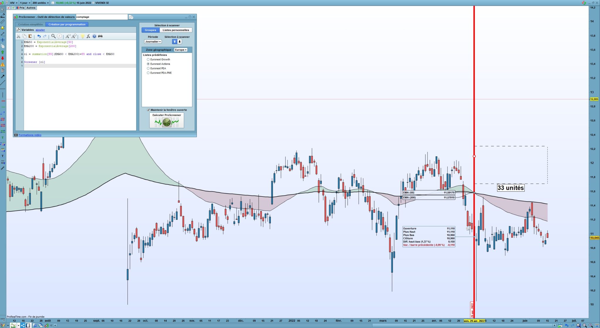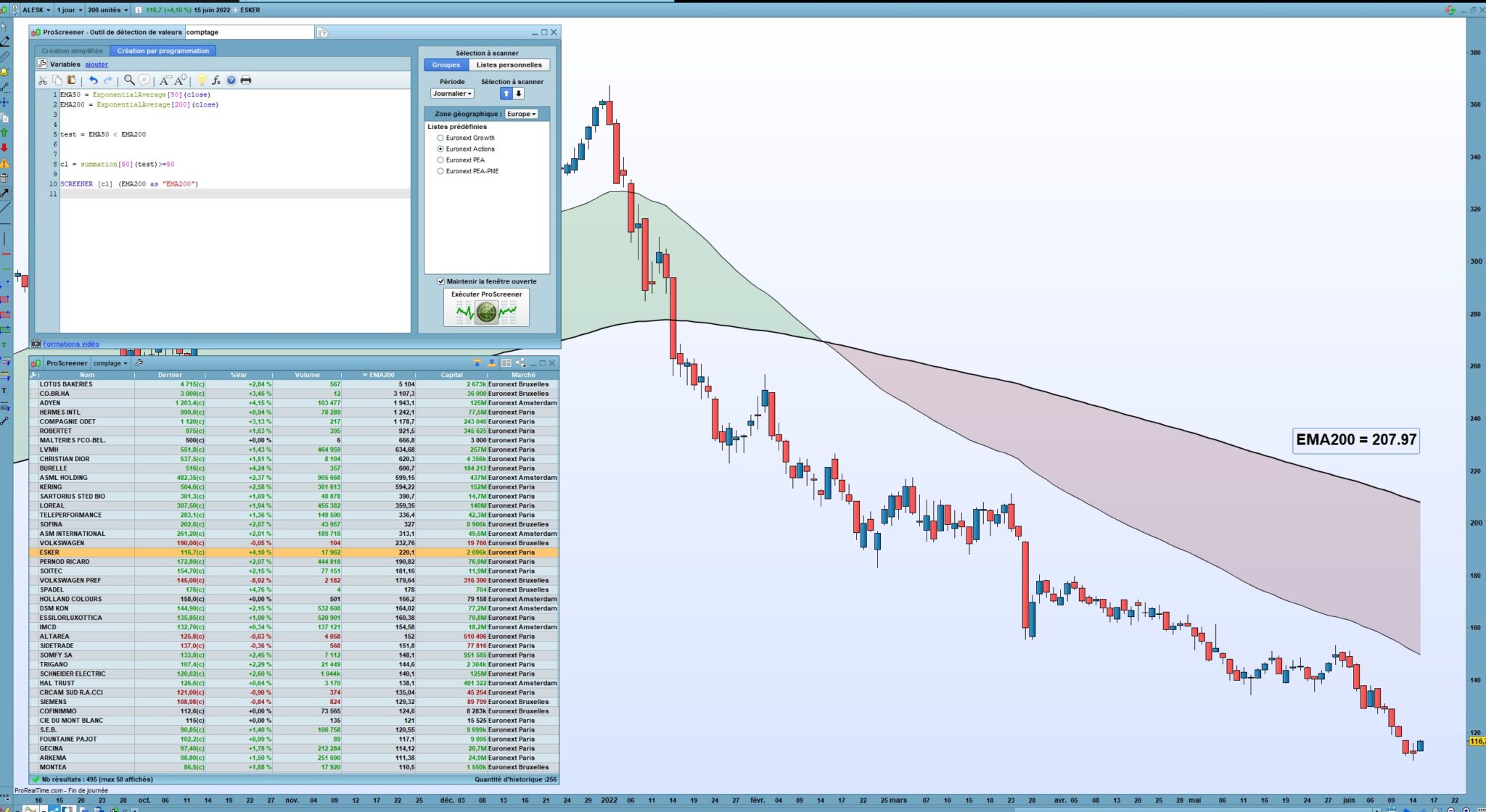 Donc pour les screeners, c’est difficile de calculer avec un ema200 car on ne peut retourner que 255 bougies en arrière et la Moyenne mobile ne se calcule pas de la même façon.