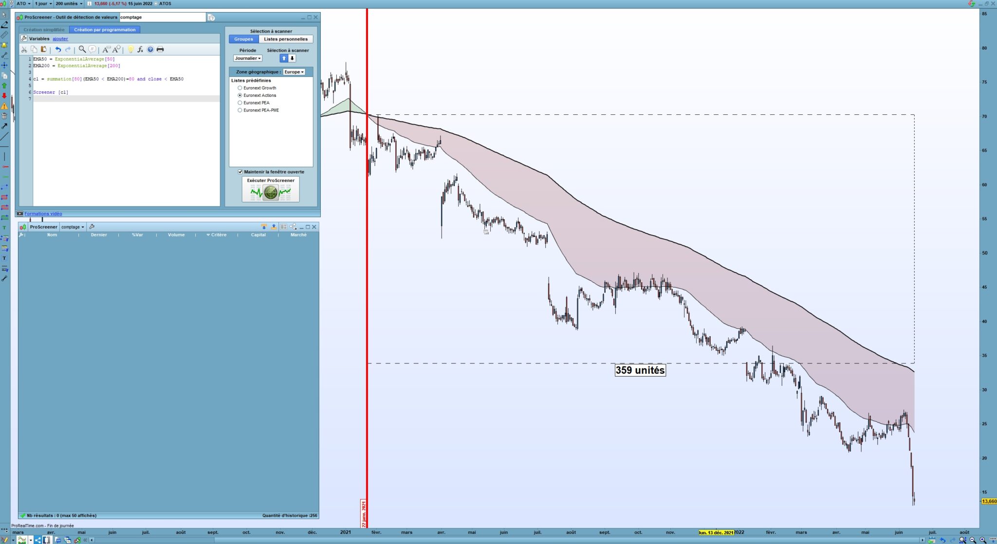Photo 2 : Atos qui est à 359 unités qui devrait me la trouver et je demande minimum 80 et le screener est complètement vide avec 80 alors que je pense qu’il y a beaucoup plus d’actions qui respectent ses conditions.
