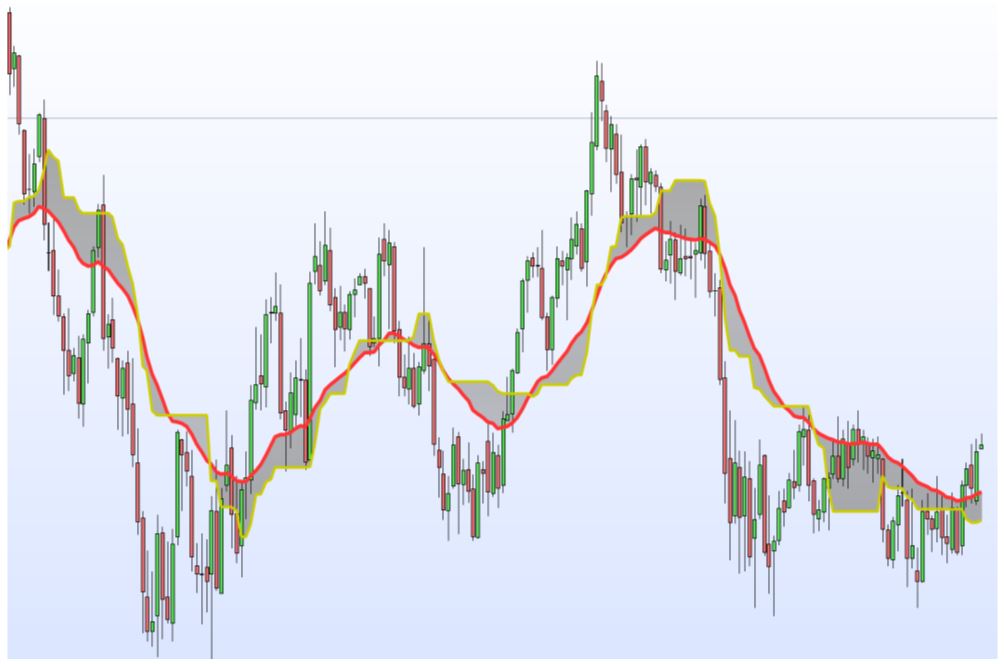 Busco que la plataforma me dé una alerta cuando el cierre de la vela, (en diario o semanal) supere por encima o por debajo la zona acotada por las líneas Kijun-Sen (7 22 44) del indicador Ichimoku (Línea dorada en el ejemplo adjunto) y la Ema (30) (Línea roja en el ejemplo attached)