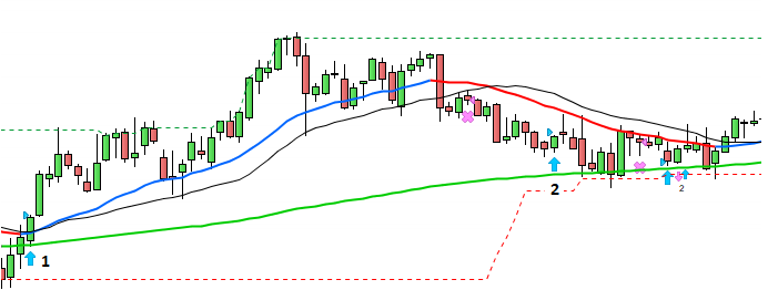 Si compras por encima de la M3o pues cerrar a mercado cuando close crosses down M30, y si compras por debajo, pues ponerle el párrafo de arriba igual con el STOP