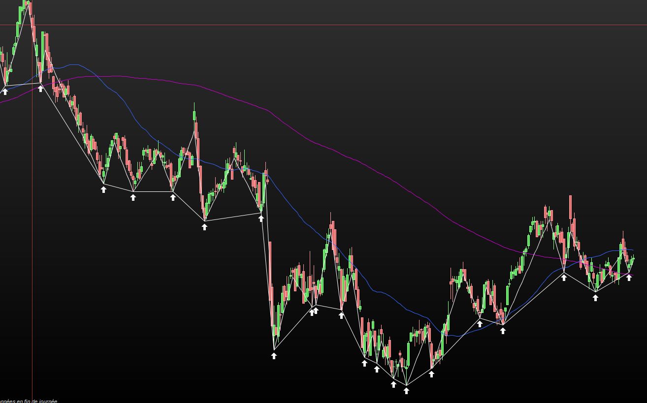 But now I search to connect 3 lows together with a segment (by zigzag). So if the segment between the lows 1 and 2 and the segment between the lows 2 and 3 have pretty much the same angle then we draw a line connecting the 3 lows.