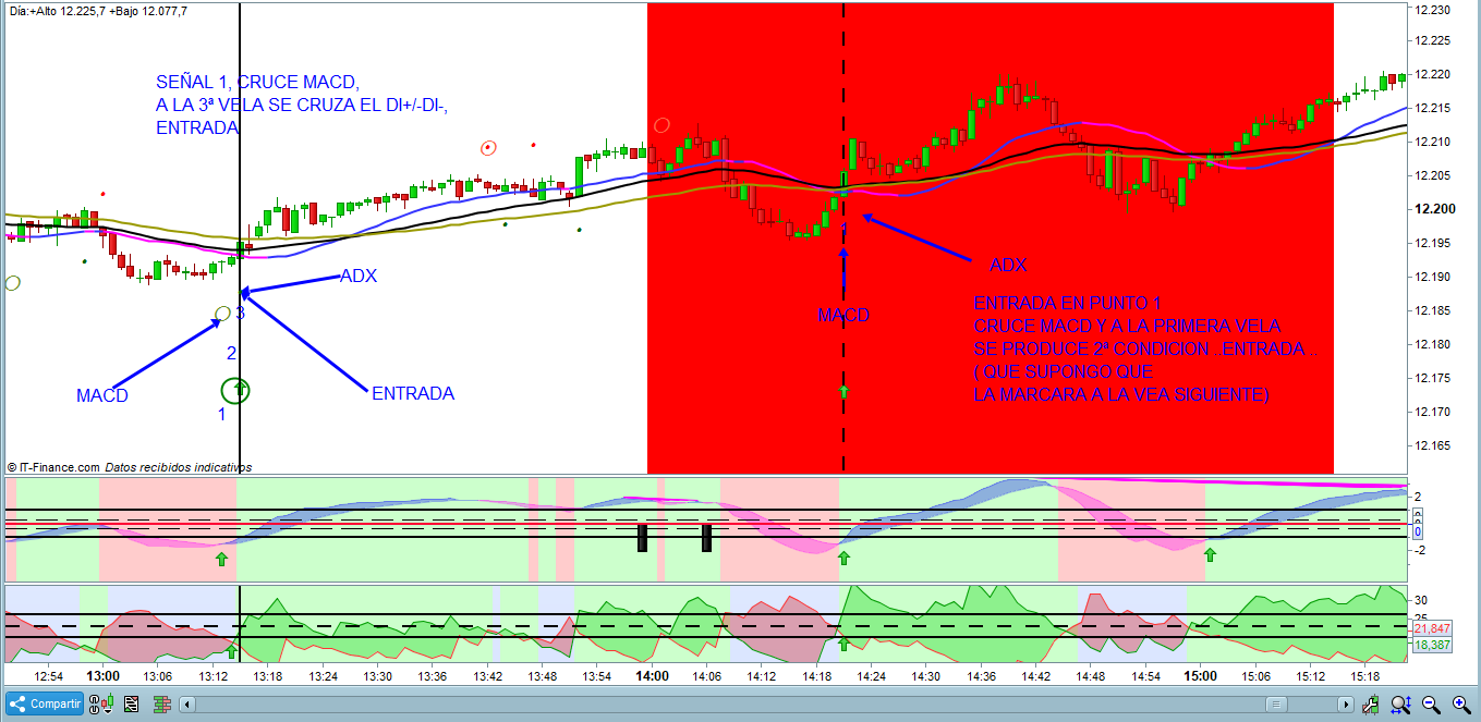 Buenas Juan , gracias de nuevo ,tengo a otro compañero buenisimo en estos temas pero no damos con el tema… lo estoy probando con el macd y adx (di+ , -di-) , se produce cruce macd (variable 1) y transcurridas 4 velas, si antes se ha producido cruce de di+ alcista -di- (variable B) entonces marca flecha..si tengo que decirte , que para señal alcista el macd debe encontrarse menor de -1 y en señal bajista menor de 1..te voy a adjuntar ejemplo, porque este aun no me da lo que quiero…los DN los da en la 5 vela..si en la 4 se produce ..no lo da en la cuarta vela..