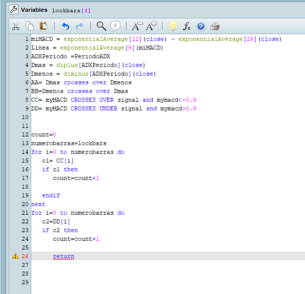Buenas Salas, creo que el problema esta en el valor que se le da a la segunda variablem, pensaba que seria mas sencillo, siempre que el macd se cruce que se cuenten las velas hasta que se produzca un cruce adx y si esta entre las 4 velas siguientes,,entrada..creo que eso ya esta claro pero no se como se le da la variable o la condicion …la importancia radica primero en el cruce macd..si no se produce netre esos valores no hay entrada..creo que el problema esta en el cruce adx..com es posible que no se pueda sacar una condicion si se produce esa variable, el cruce..de todas formas Salas te agradezco tu tiempo..pero no da señales ..y las da muy muy tardia,,te adjunto imagen..por si te sirviera