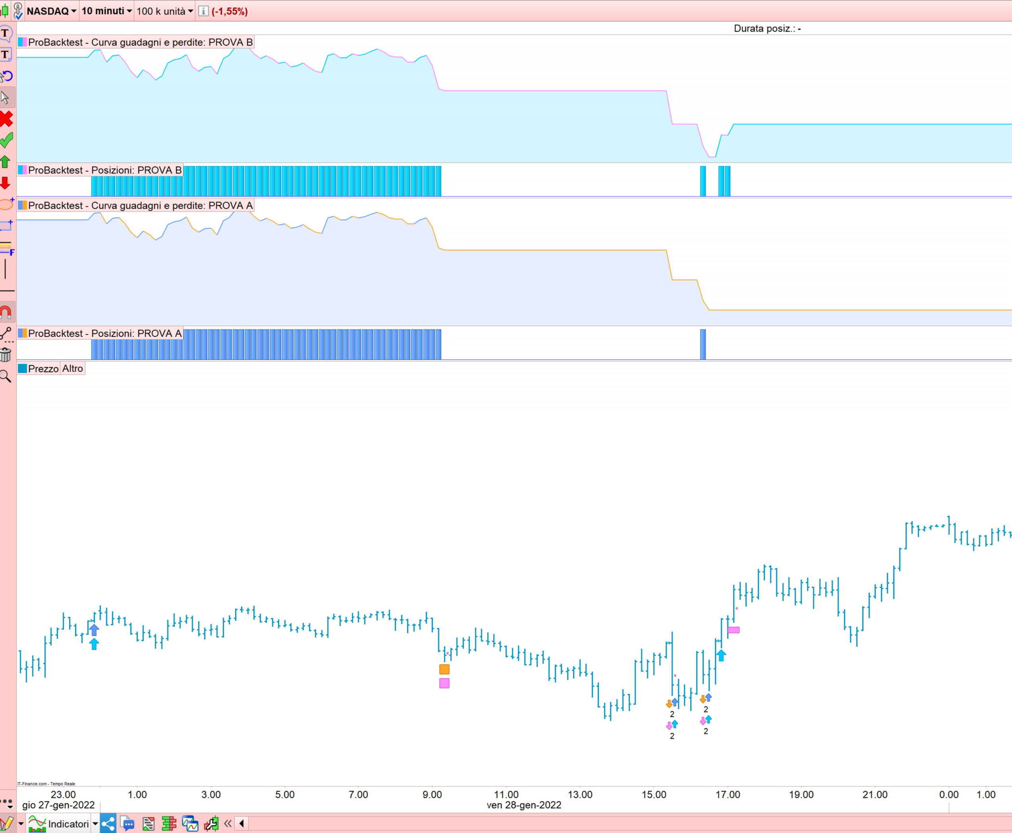 2) [Il 28 gennaio 2022 ( vd immagine B) poi c’è un operazione visibile nel probacktest ed anche nell’indicatore delle posizioni, ma non segnalata da nessuno dei due codici (e non presente quindi nel listato delle operazioni)