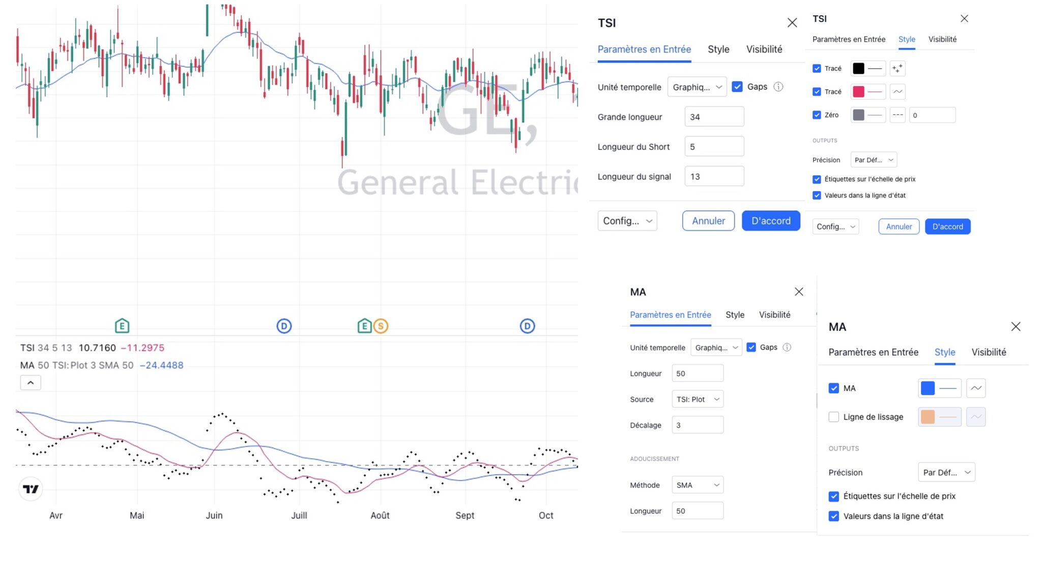 Ensuite sur ce même indicateur j’applique une SMA50 basé sur le TSI 3 (en points)