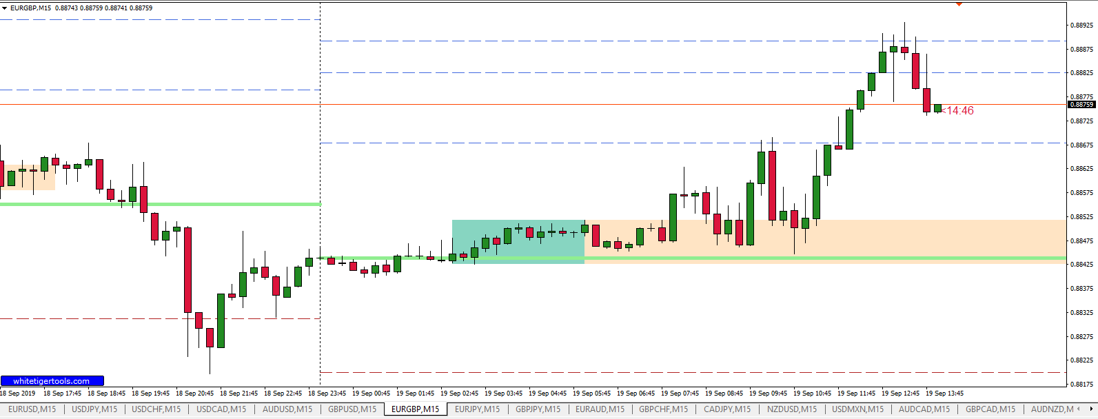 El sistema verificará el nivel de precio más alto y el más bajo al final de un periodo definido (desde las 03:00 hasta las 06:00) en gráficos de 15 minutos. A continuación, se lanza una orden de compra cuando el cierre de una vela está por encima del nivel superior o una orden de venta si el cierre de una vela está por debajo del nivel inferior.