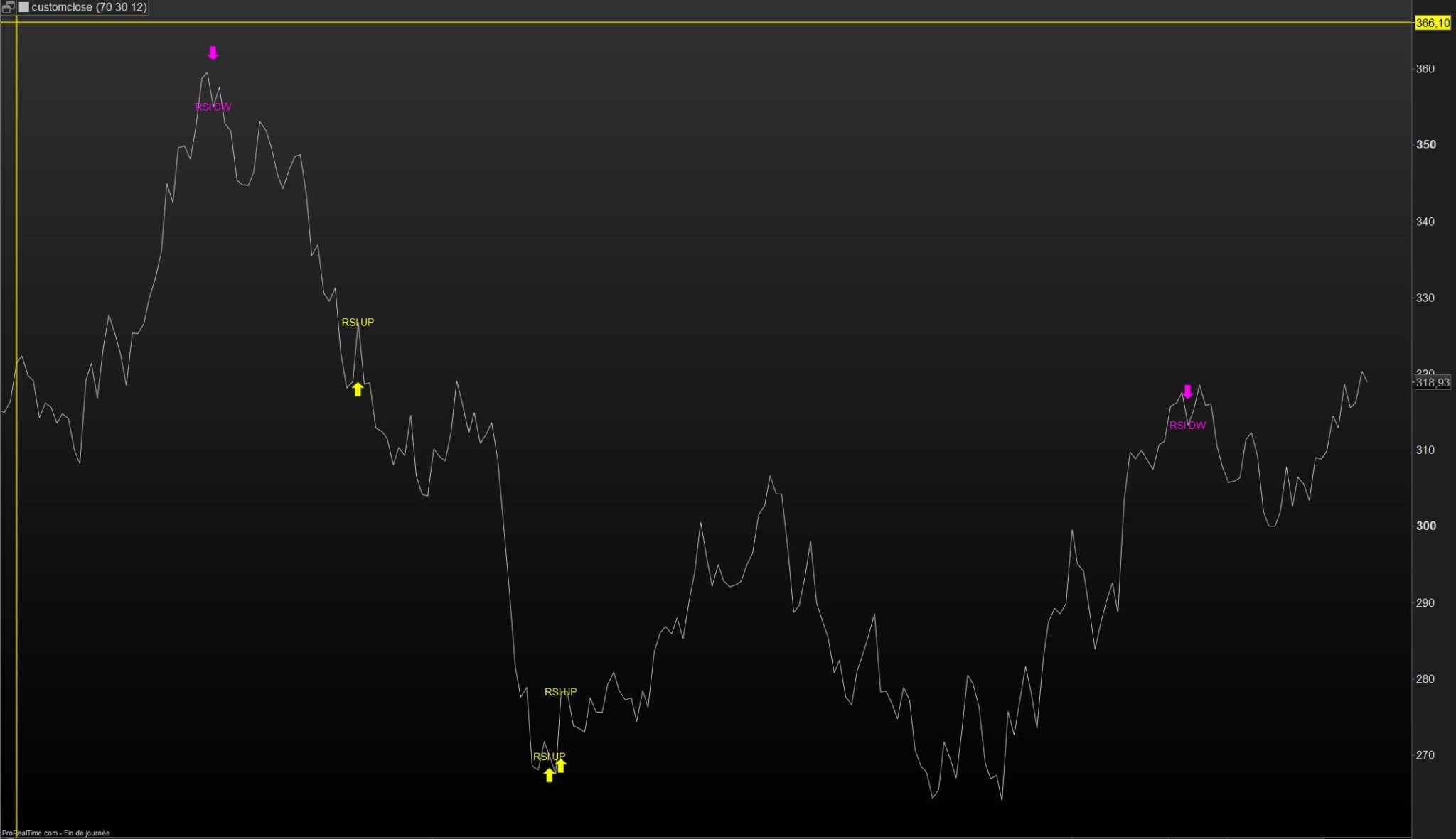 Ci-dessous le code traduit pour prorealtime, il s’agit de tracer des flèches de couleurs sur de grandes bougies lorsque le RSI quitte les zones de surachat et de survente.