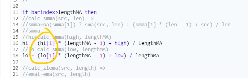 J’ai un doute sur ma conversion de la ligne “smma=na(smma[1]) ? sma(src, len) : (smma[1] * (len – 1) + src) / len” car je n’ai pas pris en compte la partie “na(smma[1]) ” que je ne comprend pas bien.