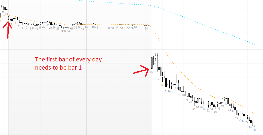 Thank you for your code snippet. I found out changing count = 0 to count = 1 makes the first bar of the day bar 1 every day.