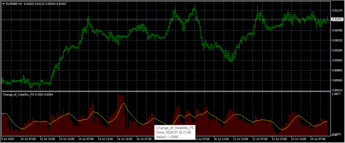 There are a lot of ways to measure volatility (changeability). One of them is calculation of the standard deviation of returns for a certain period of time. Sometimes the current volatility on a short period of time (for example, 6 days) is correlated with volatility of a larger period (for example 100 days). This indicator calculates the correlation of a short volatility Vol_short and a long volatilityVol_long. Vol_change=Vol_short/Vol_long