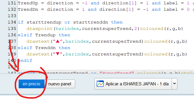 command, the line of the supertrend will now be projected on the Price area. It is not said that this will always work for each Indicator you convert to Strategy Code, but withhout really looking into it, this one should work regarding that.