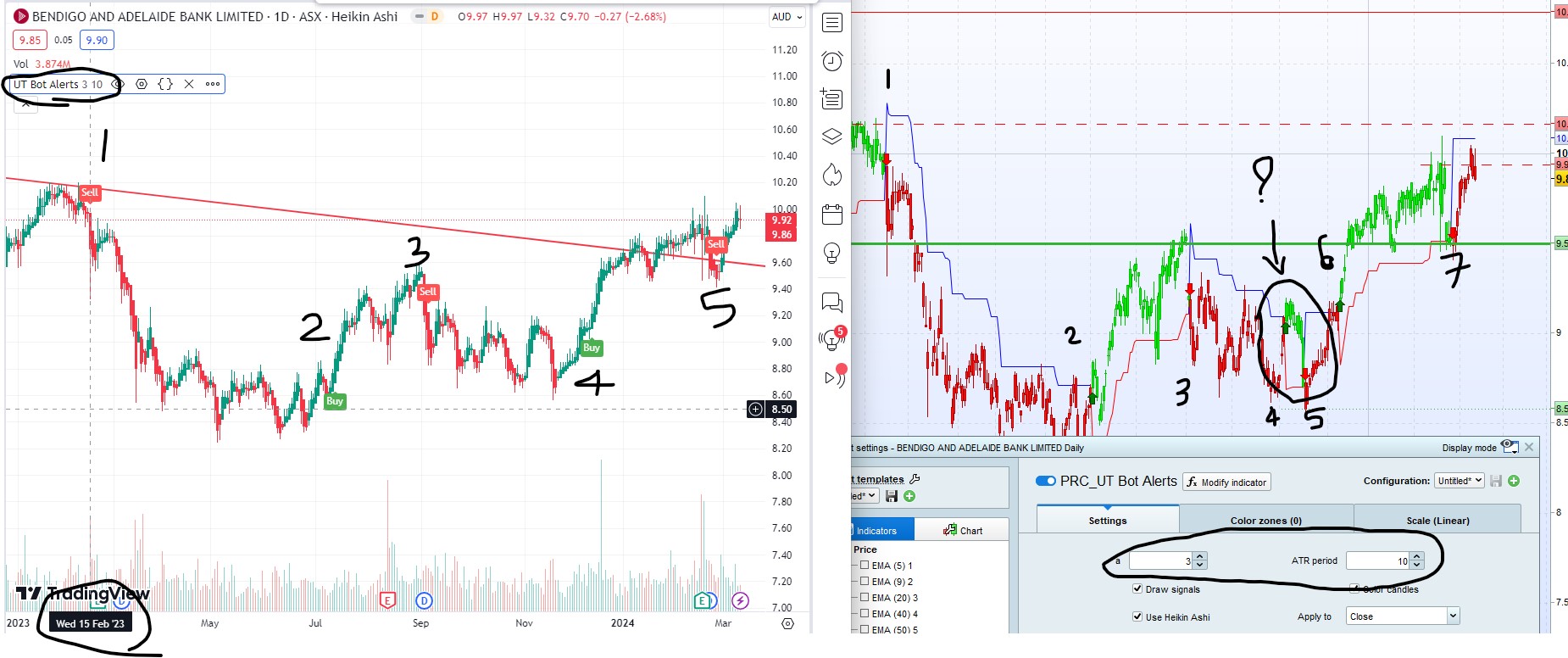 Yes, I used Key value as 3 and ATR period as 10. See attached screenshot with all value visible. As you can see signal number 1, 4 and 5 of trading view is same as signal number 1, 6 & 7.