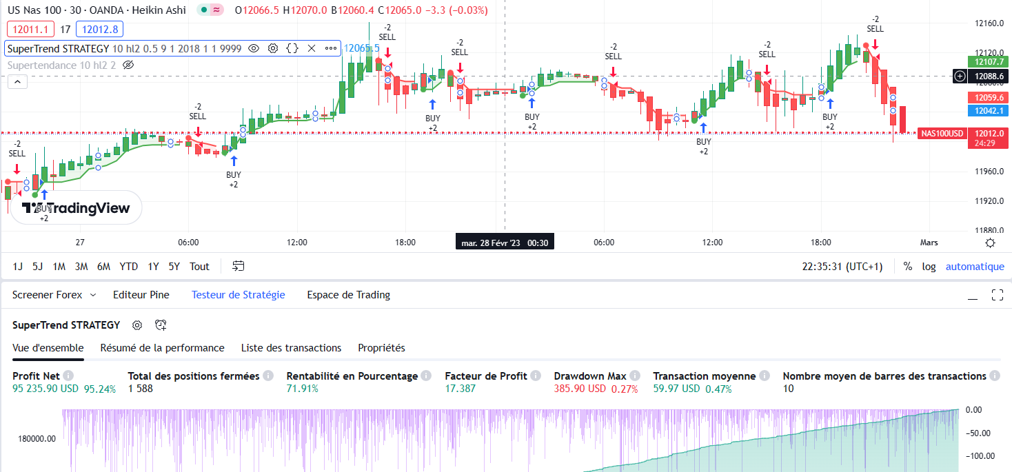 les réglages de périodes ATR 10 et multiplicateur de 0.5 il doit être utilisé avec les bougies heikin Hachi en 30 min .