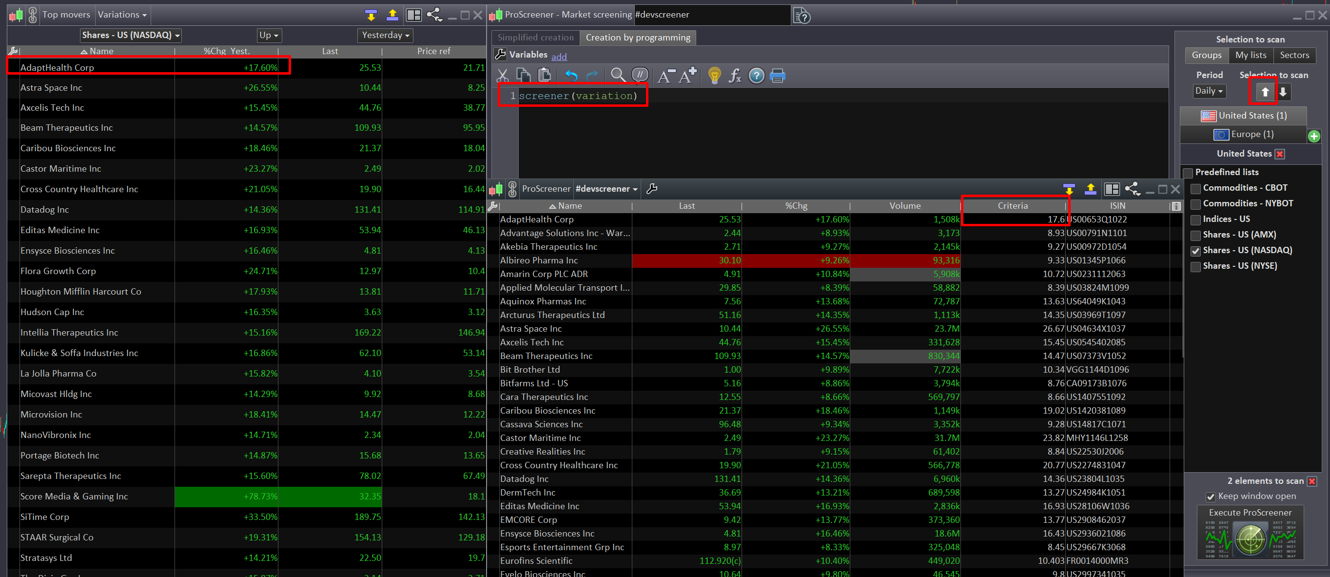 Serait-il possible d’avoir le code proposé par PRT du : Palmarès > Variations Hausse > ouverture ? Je souhaiterais que ce code serve de base pour un proscreener.