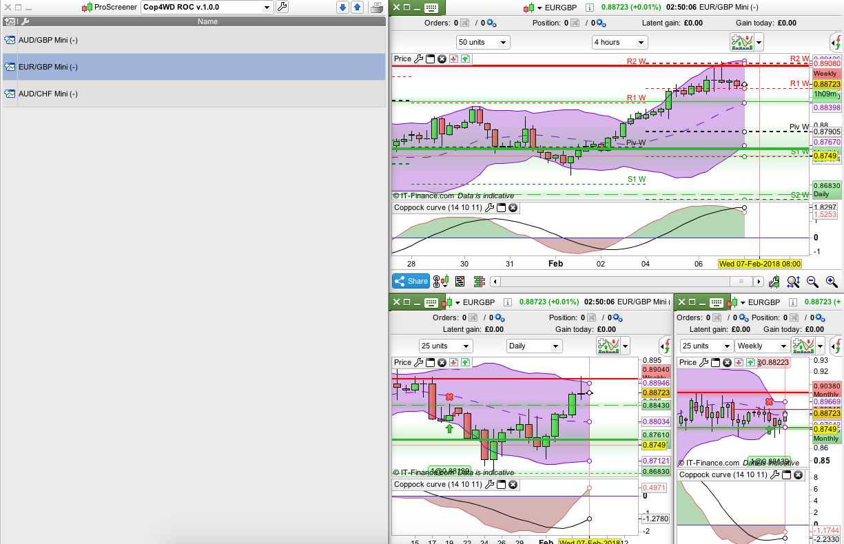 as can be seen in the picture, the eur/gbp detected but in 4 hour timeframe, the slope of coppock curve is in different direction than Daily and weekly time frame.